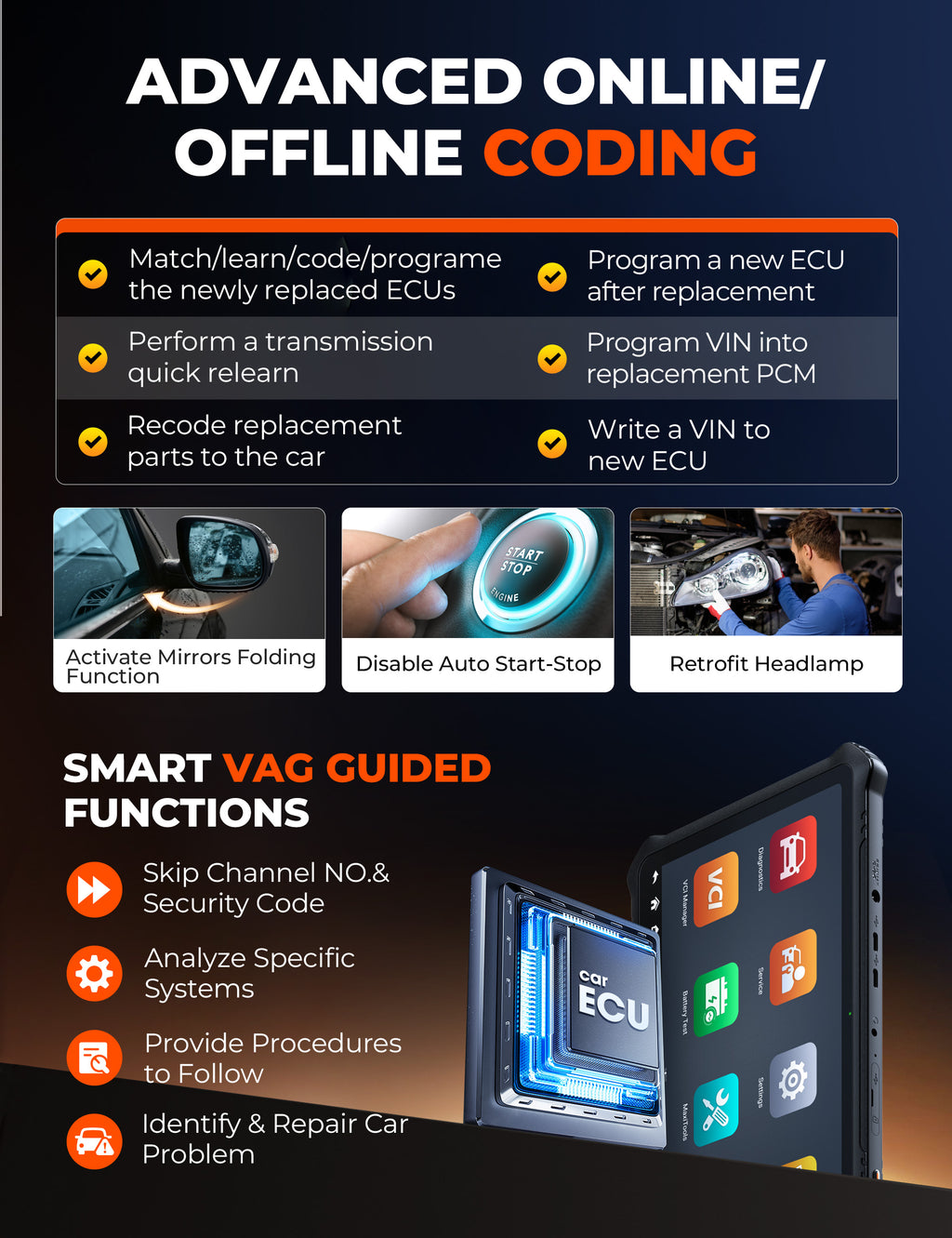 This scan tool can rematch/recode replacement of CEM/ECM/TCM/ABS/etc.; open/close functions as automatic mirrors/seatbelt warning/etc. ONLINE: for V-W/A-udi/Skoda/Peugeot/Citroen/DS/etc. OFFLINE: for V-W/A-udi/Bentley/Lamborghini/Bugatti/Porsche/etc. **Don’t support ECU program.